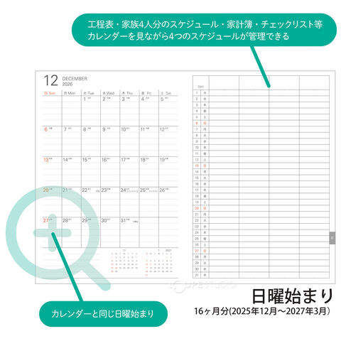 レイメイ スケジュール帳 ノート 2026年 1月始まり 2025年12月 システムノートダイアリー マンスリー ビジネス手帳 持ち歩き Raymay 24システムノートダイアリー 4プラン日曜始まりB6スペック