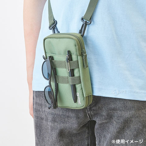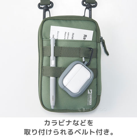 トラベル小物を持ち運びできるショルダーベルト付きポーチ。