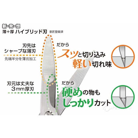 当社独自開発〈薄+厚ハイブリッド刃(意匠登録済)〉を採用。刃先がシャープな薄刃なのでスッと切り込み軽い切れ味。切るものが潰れにくく、また、通常負荷の大きい刃の先端まで軽く切れます。細かな作業にも最適。それに対し、刃元は丈夫な3mm厚刃で、硬めの物もしっかり切ることができます。