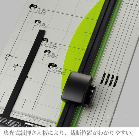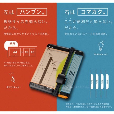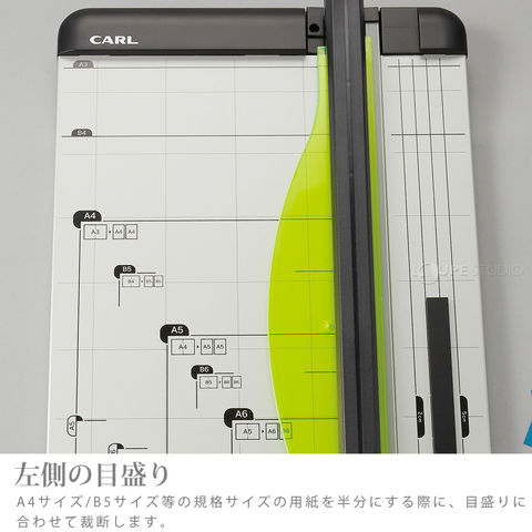 目盛りが盤面の左側/右側の両方に付いているから、裁断用途に合わせて使い分けができます。視覚的にわかりやすいイラストで表現された目盛りによって、規格サイズの用紙を半分に切ることも、短冊やカードなどの小さなものを切ることも、どちらの作業にも対応しています。
