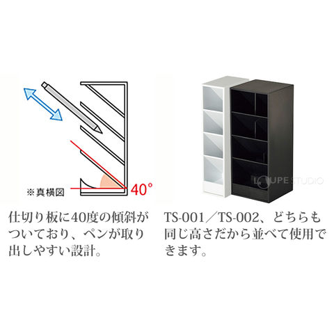 文房具、化粧品やキッチン用品など、小物の収納に活躍するマルチケース。縦置きでも横置きでも使えて便利。フレキシブルに活躍します。縦にも横にも置けるので、デスクの空いているスペースに合わせて置くことができます。縦置き時は仕切りに40度傾斜角度がついているから、筆記具を出し入れしやすい構造になっています。