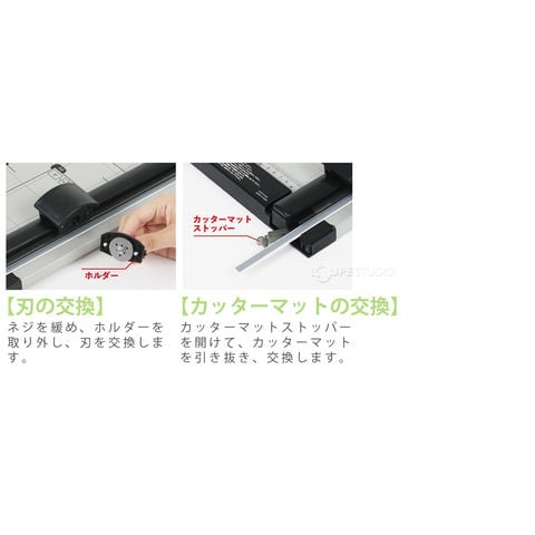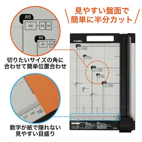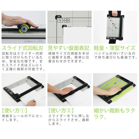 - 【特長】スライダーを押しながらスライドさせるだけの安全裁断。