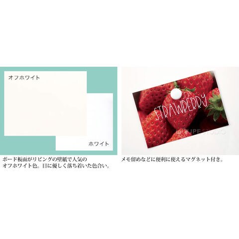 | 付属品 | ボードマーカー(直液式細字/黒インク)1本 マグネット(直径20mmφ)2コ 受け皿(W20cm)1コ 吊り下げ用ヒモ(45cm)1本 吊り下げ用金具2コ |