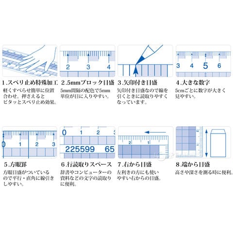 方眼目盛がついているので平行・直角に線引きしやすい。