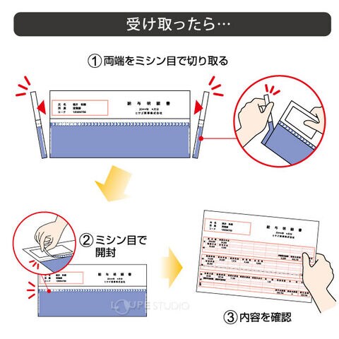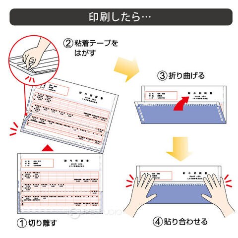 給与明細や、納品書、請求書など罫線ごと印刷してテープを剥がして折り曲げるだけ。
