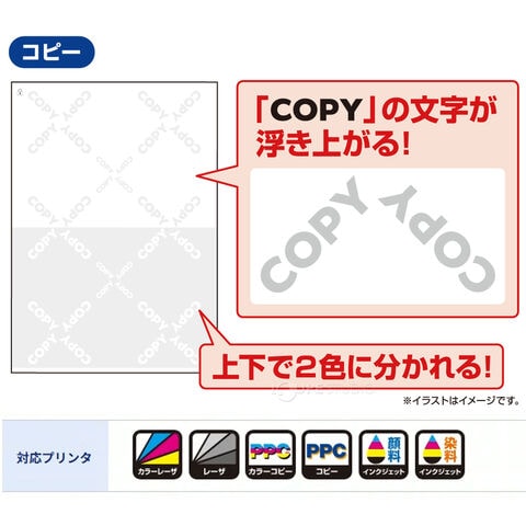 | 注意事項 | ※本製品は、その利用により、いかなる改ざんも防止することを保証するものではありません。 ※お使いになるコピー機の種類や設定(カラーモードなど)によっては、正常な効果が得られない場合があります。 ※コピー側の書類の内容を読めなくするものではありません。 ※FAX・スキャナでも同様の効果が得られます。 |