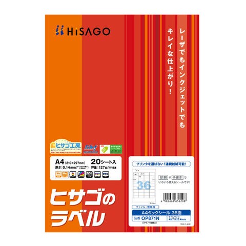ヒサゴ A4タックシール 36面 OP871N 上質紙 プリンタ対応