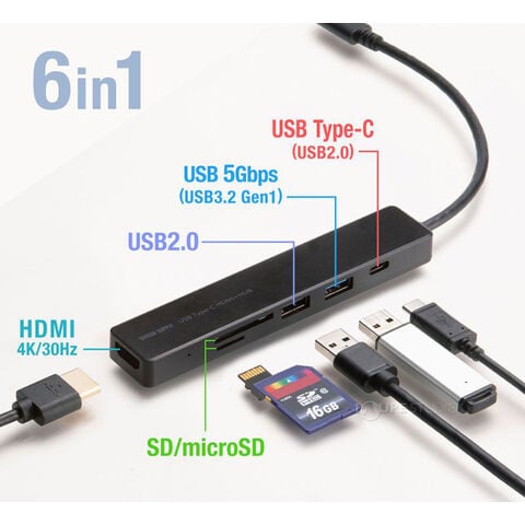 - USB 5Gbpsポート、USB 2.0ポート、Type-C(USB2.0)ポート、SD/microSDカードリーダーを搭載しており、 最大3台までのUSB機器を接続できます。