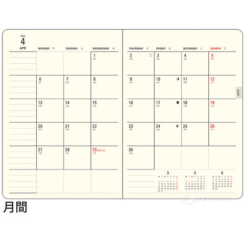 カバンの中でも紙の端が折れない角丸のフォルム、書き心地の良い手帳専用用紙を使用し、先まで見通せるミニカレンダーが付いています。