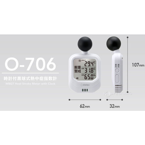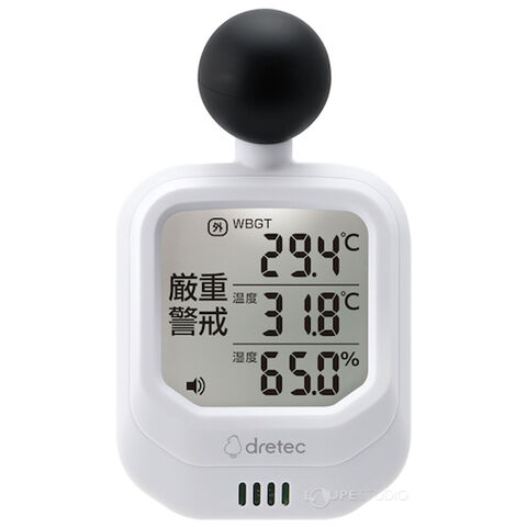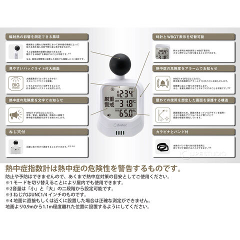 熱中症指数計 壁掛け 屋外 ドリテック 時計付 黒球式熱中症計 温湿度計 熱中症計 カラビナ バンド付 熱中症 対策 温度計 気温 湿度計 夏 暑さ対策 アラーム おすすめ DRETECスペック