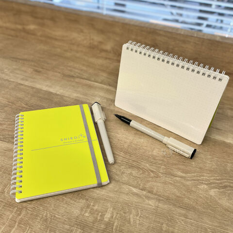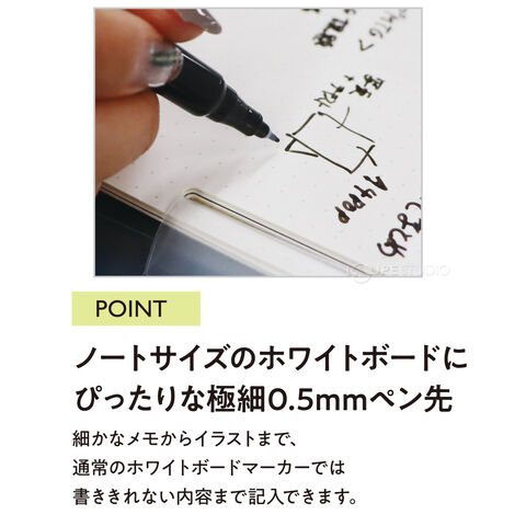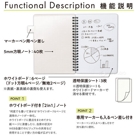 | 仕様 | 方眼ノート40枚80ページ、ホワイトボード6ページ(ドット方眼4ページ、無地2ページ)、透明保護PPシート3枚、ペン差し付き、ゴム付き、イレイサー付ホワイトボードマーカー Φ15mmペン先0.5mm程度、OPP袋入 |