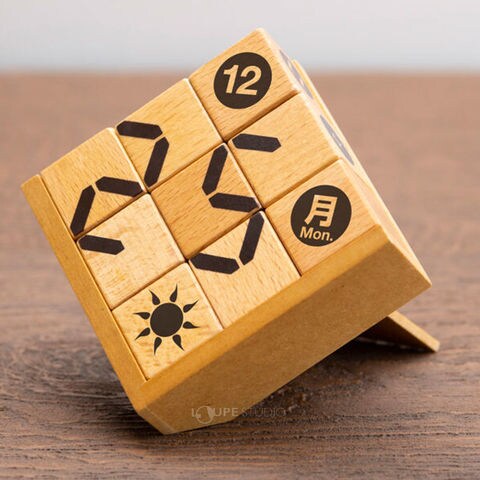 9つのピースを組み合わせて数字をつくる木製の卓上カレンダーです。9つのブロックには月を表示する1?12の数字、曜日の表示、天気を表示するマーク、そしてバラバラのデジタル数字が印字されています。これらをうまく組み合わせて毎日その日のカレンダーを作成してみましょう。