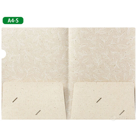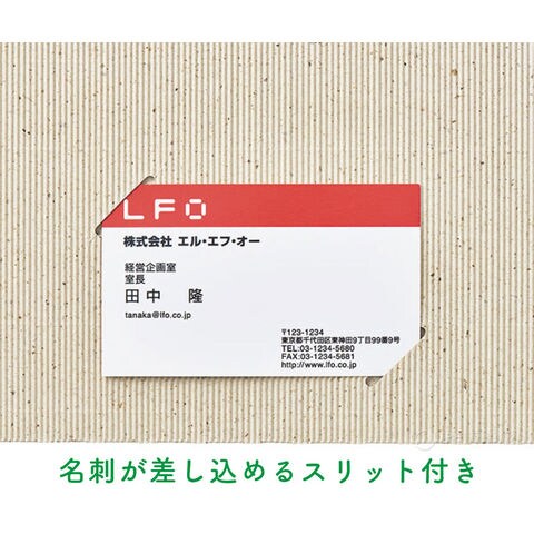 - 二つ折り紙製ホルダー(茶殻紙タイプ)は、表面に波状加工がされているため折れ曲がりにくく、書類をしっかりと保護することができます。また名刺を差し込めるスリット付きで、資料と合わせて名刺もまとめてしまうことが可能です。