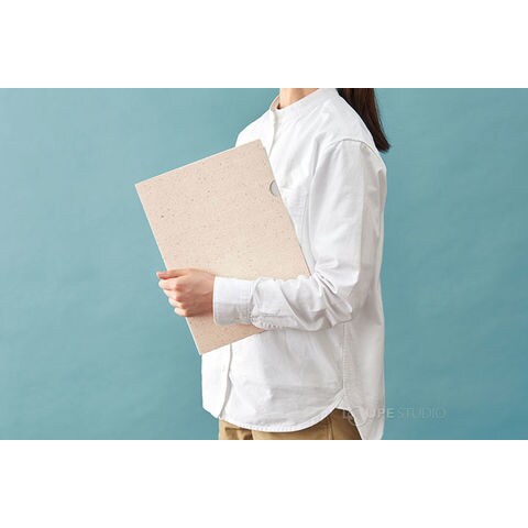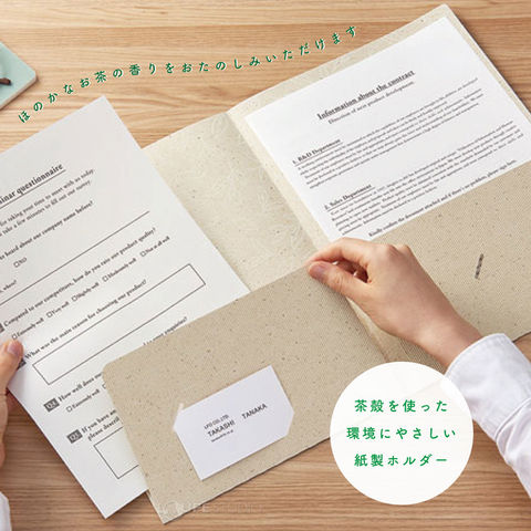 茶殻配合の紙なので書類が透けにくく、またホルダーごと廃棄できるので情報保護性や環境対策にも優れています。 - 茶殻を使った環境にやさしい紙製ホルダー