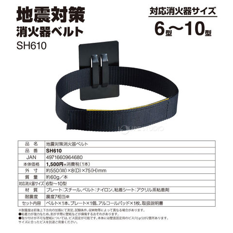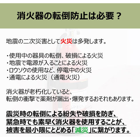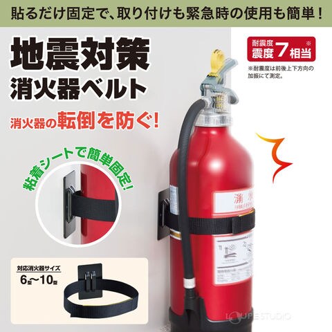 消火器に取り付けて震災時の転倒を防止するベルトです。プレートを壁に接着してベルトを通し、ベルトを消火器に巻いて固定します。面ファスナーでの固定になるため、緊急時にも取り外しが簡単です。震度7相当に対応しています。