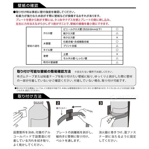 プレート裏面の粘着シートを壁に接着し、プレートに通したベルトを消火器に巻き付けるだけで簡単に設置することができます。ビス固定は不要です。普及している6型~10型の消火器に対応しています。※プレートにビス穴(直径5mm)が2箇所あるため、ビス固定も可能です。