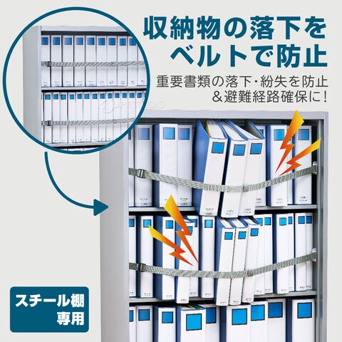 重要書類を保管しているファイル、段ボール、保存箱、ボックスファイル、雑誌やカタログなどさまざまな収納物の落下を防止します。