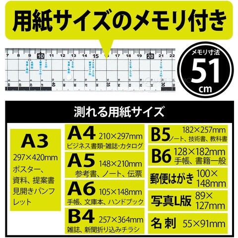 サイズカッター定規51cm ものさし カッター 紙 切る 文具 学校 教材 学童用品 工作 図工 長さ 計る ステンレス板付きスペック