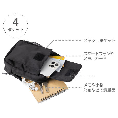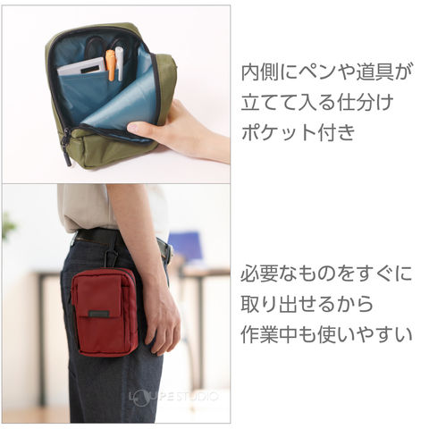 身の回りの物を身に付けられる。多機能ポケット付の腰回り収納