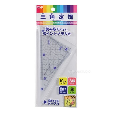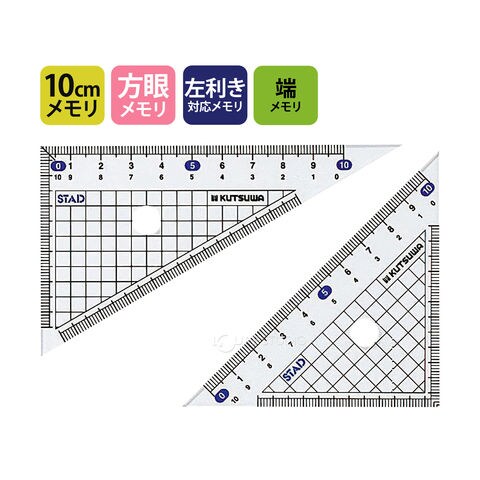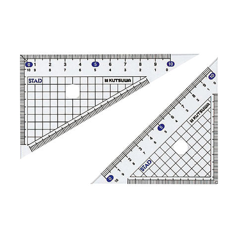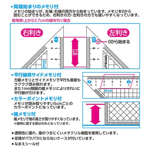 | サイズ | (直角三角定規)H70×W120×D2mm、10g(目盛り寸法10cm) (直角二等辺三角定規)H60×W120×D2mm、9g(目盛り寸法10cm) |