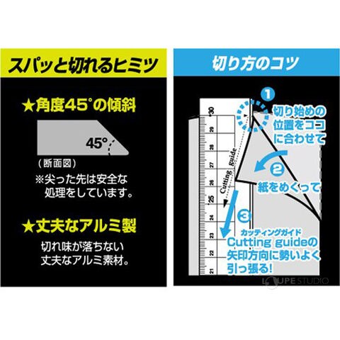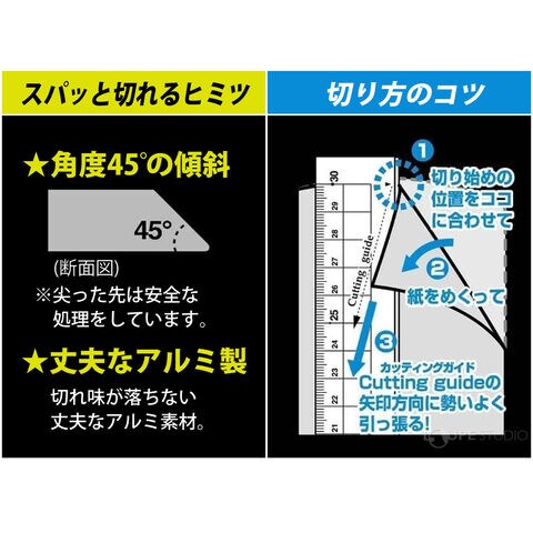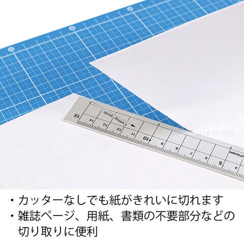 - 雑誌ページ、用紙、書類の不要部分などの切り取りに便利