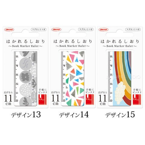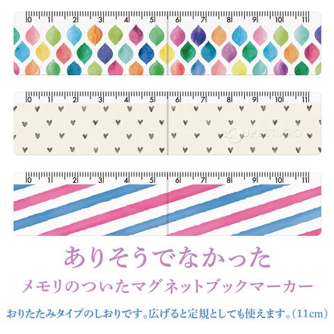 おりたたみタイプのしおりで、広げると定規としても使えます。(11cm)。カラフルな色を使い、ウィットに富んだチャーミングなデザインで、手軽に雰囲気を変えたい!という方にぴったりのアイテムです。