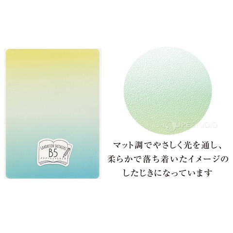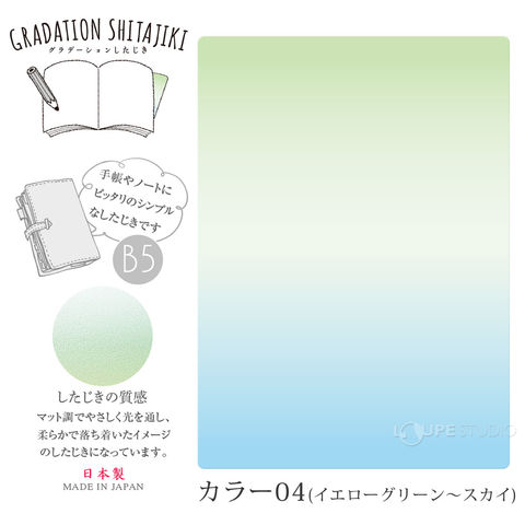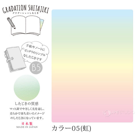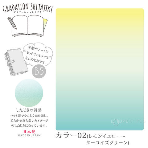 ミックスグラデの色合いと淡いトーンが大人っぽいテイストのしたじきです。シンプルながらもキレイな色合いを活かし、マット調の生地はやさしく光を通すため、大人の普段使いにもピッタリな落ち着いたイメージのしたじきになっています。ちょっとしたカラーアクセントになるのでノートや手帳の間に挟んでしおり代わりにも。