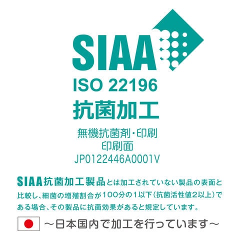 • SIAA抗菌加工製品とは加工されていない製品の表面と比較し、細菌の増殖割合が100分の1以下(抗菌活性値2以上)である場合、その製品に抗菌効果があると規定しています。