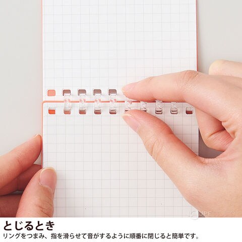 とじるとき:リングをつまみ、指を滑らせて音がするように順番に閉じると簡単です。