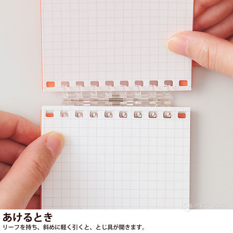※ ツイストノート(メモサイズ)(品番:N-1661)とじ具が開くのでリーフの差し替えも可能です。また、大きいサイズのオープンリングノート/ツイストノートにもリーフをとじることが出来ます。
