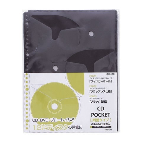 CDポケット 5枚パック A4 S型 30(2・4)穴 両面タイプ リヒトラブ 収納ケース 整理 保管 DVD ブルーレイ 文具 文房具 事務用品 黒台紙 学校 オフィス LIHIT LAB