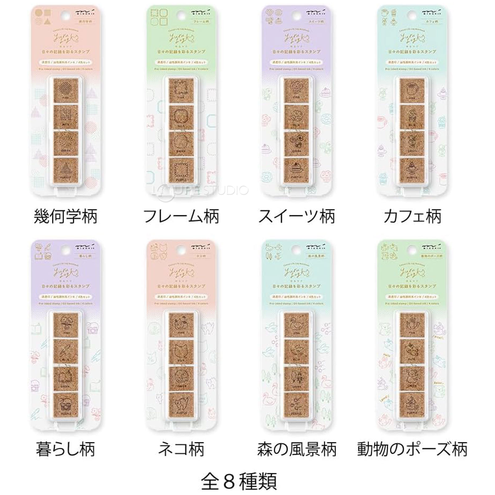 内容浸透印スタンプ×4柄入(4色/ピンク、青、緑、紫)×2個入