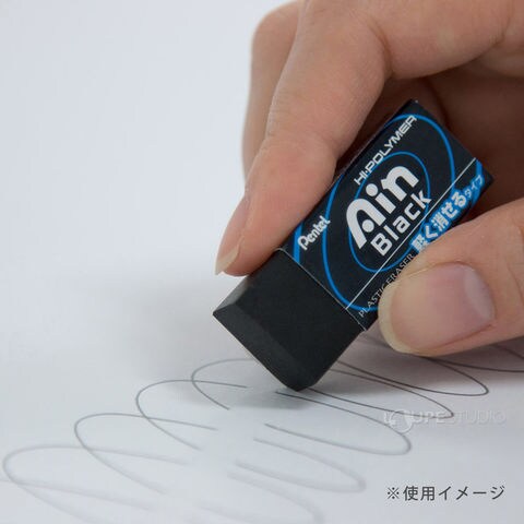 消しゴムに付着した汚れが目立たないブラックボディ。少ない消しくずで机を汚さず、軽い力で楽に消せます。