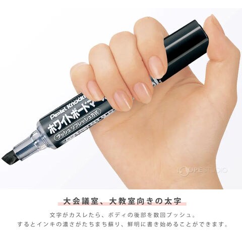 大会議室、大教室向きの太字。インキが薄くなったら数回プッシュすれば、濃さが戻り、鮮やかに書けます。ペン先が傷まない後部プッシュ式。インキ残量が確認できる表示窓つき。