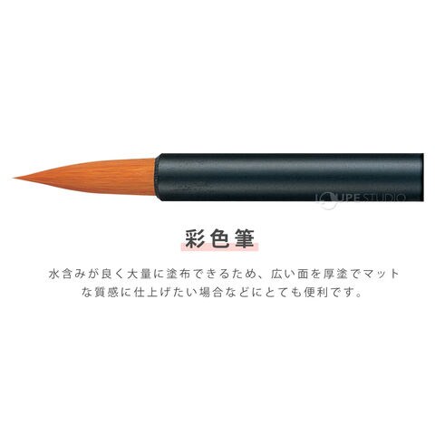 独自製法の特殊毛材を使った、まとまりが良く、耐久性に優れた穂先のデザイン筆。デザインから絵手紙まで幅広く使え、アクリル系えのぐも使えます。水ふくみが良く、面塗りに適しています。