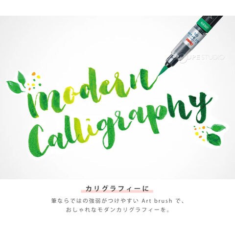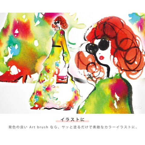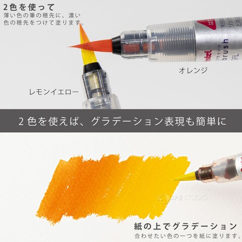 カラーインキと毛筆が一つになったカラー筆。毛筆特有の柔らかな線の表現が可能。みずみずしく鮮やかな発色で水彩表現ができ、文字を書くだけでなく水彩画やイラストにも適しています。穂先は高品質の人造毛を使用しているため、バラけず耐久性に優れています。18色の全色セット。