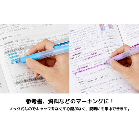 ペン先の出し入れは押すだけ!ノック式だから、キャップを失くすことがありません。片手ですぐに使うことができます。普通紙・OA用紙に使えます。