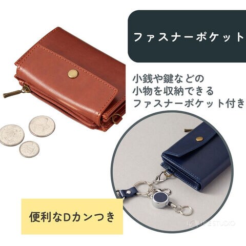 | 仕様 | 仕切付きカードポケット、ファスナーポケット、Dカン付き |