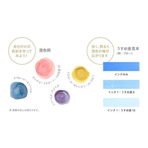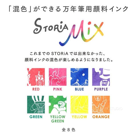 ※従来のストーリア顔料ボトルインク(13-1006)とSTORiA MiXの混色はできません。STORiA MiXと専用うすめ液のみ混色が可能となります。