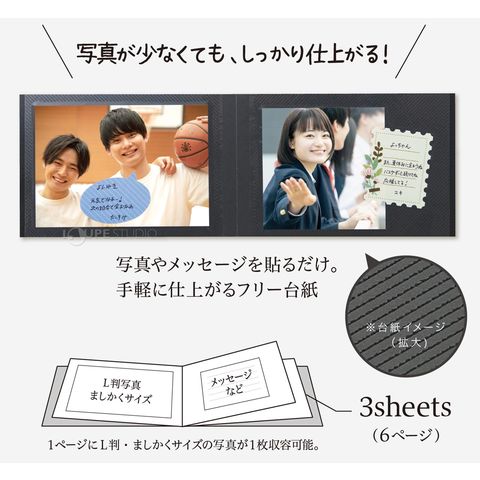 写真が少なくても手軽に作りやすい、小さいサイズで少ないページ数。記念日のお祝いや少人数での送別用のギフトにも便利。1ページにL判、又はましかくサイズの写真が1枚貼れます。(フリー台紙3枚全6ページ)