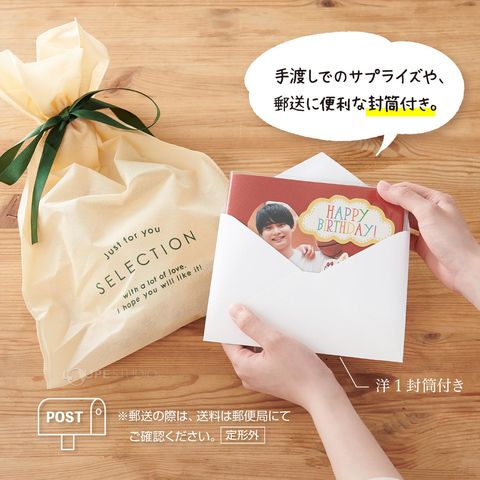 ギフトに適した、手渡しでのサプライズや郵送に便利な洋1封筒付き。遠方の友人や家族への贈り物にも便利です。