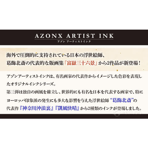 - 独自の画風を確立し、世界的にも有名な日本を代表する画家で、ヨーロッパ印象派の発生にも多大な影響を与えた「葛飾北斎」の代表的版画集「富嶽三十六景」から「神奈川沖浪裏」と「凱風快晴」の2種類の絵をイメージしたインクが登場。