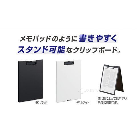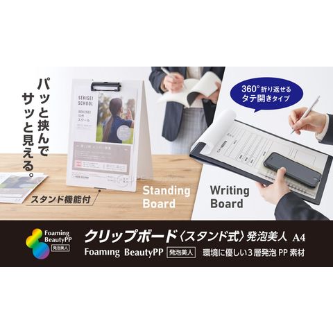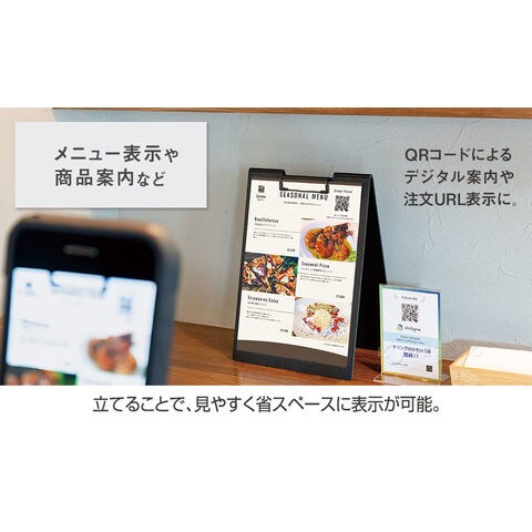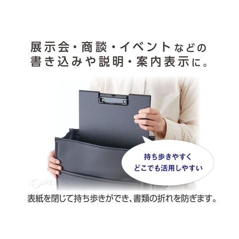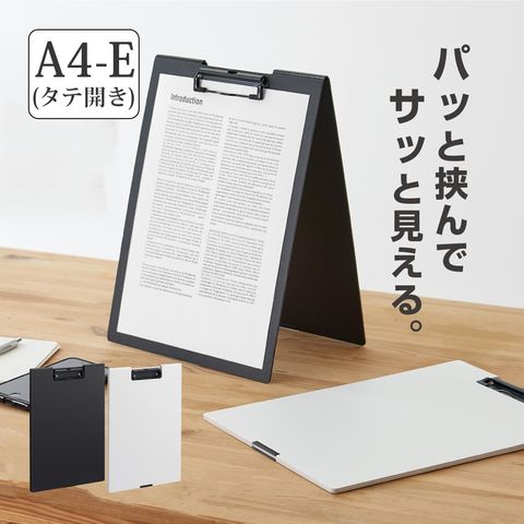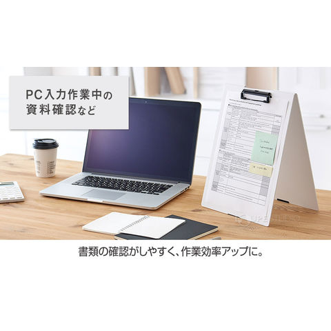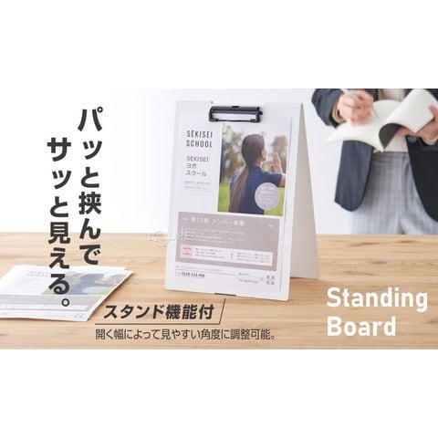 パッと挟んでサッと見える、書類の確認や案内表示に便利なスタンド機能付。開く幅によって角度の微調整が可能。展示会やイベントなどの説明案内、パソコンの入力作業の資料確認に便利です。