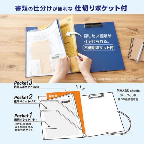 書類の仕分けに便利な仕切りポケット付。小さな書類やすぐに確認したい書類、目隠したい書類など、用途で使い分けが可能な3ポケット仕様。