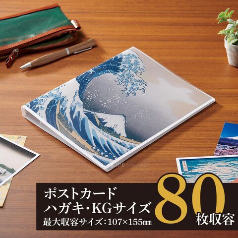 2段80ポケット。ハガキやKG写真を80枚収容できます。KGサイズの写真(102×152mm)とポストカード(105×148mm)・ハガキ(100×148mm)が収容可能。最大収容サイズ:107×155㎜