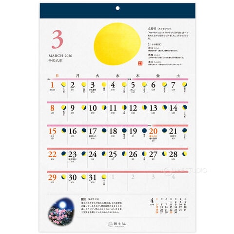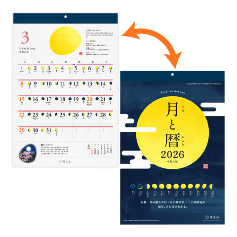 月の満ち欠けや、旧暦、二十四節気の変化を通して、季節の移り変わりが楽しめるカレンダーです。
