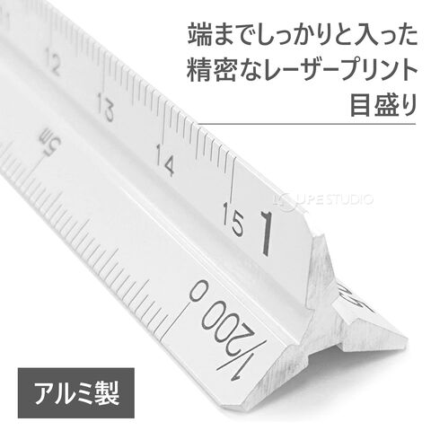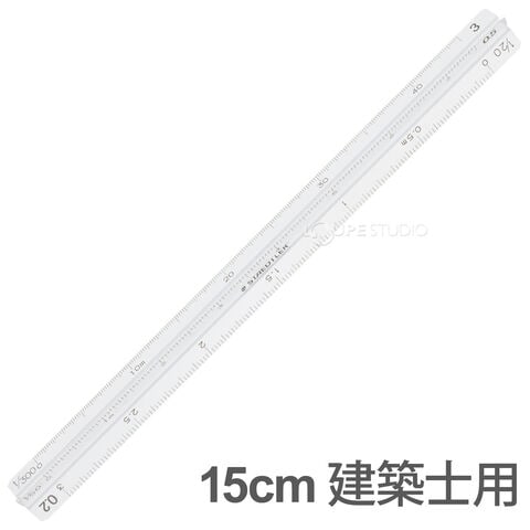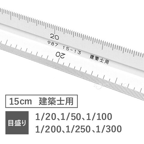 芯のすべてをアルミ製にすることにより、反りやゆがみなどの変形を極力防いだ15cmタイプの建築士用三角スケールです。レーザーで加工を施した目盛りは見やすく、狂いのない正確な縮尺となっています。目盛りは1/20・1/50・1/100・1/200・1/250・1/300です。
