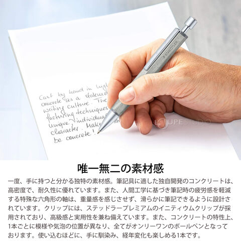 ボディにコンクリートを採用し、独特な質感を楽しめるボールペンです。手にフィットし書きやすい変則的な六角軸ボディも特徴的です。