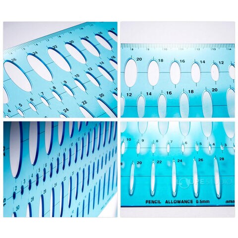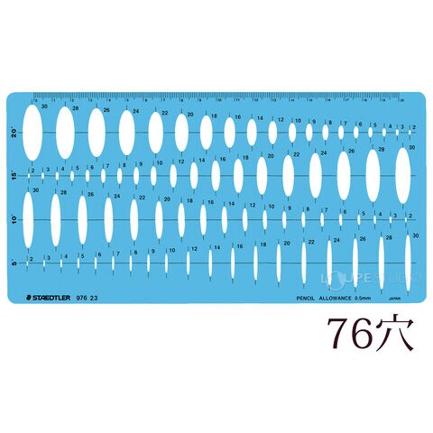 品質の良いプラスチックを精密加工し、耐久性もある総合だ円定規です。透明度が高いため図面も識別しやすく、また、ブルーの本体色は目にもやさしいです。ペンなどを使用する際、にじみによる汚れを防止するインクエッジ付きです。76穴、5°・10°・15°・20°のサイズで開いています。