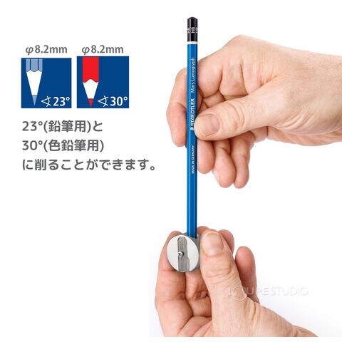 太さ8.2mmまでの鉛筆や色鉛筆が削れるドイツ製の鉛筆削りです。鉛筆用は23°、色鉛筆用は30°に削ることができます。